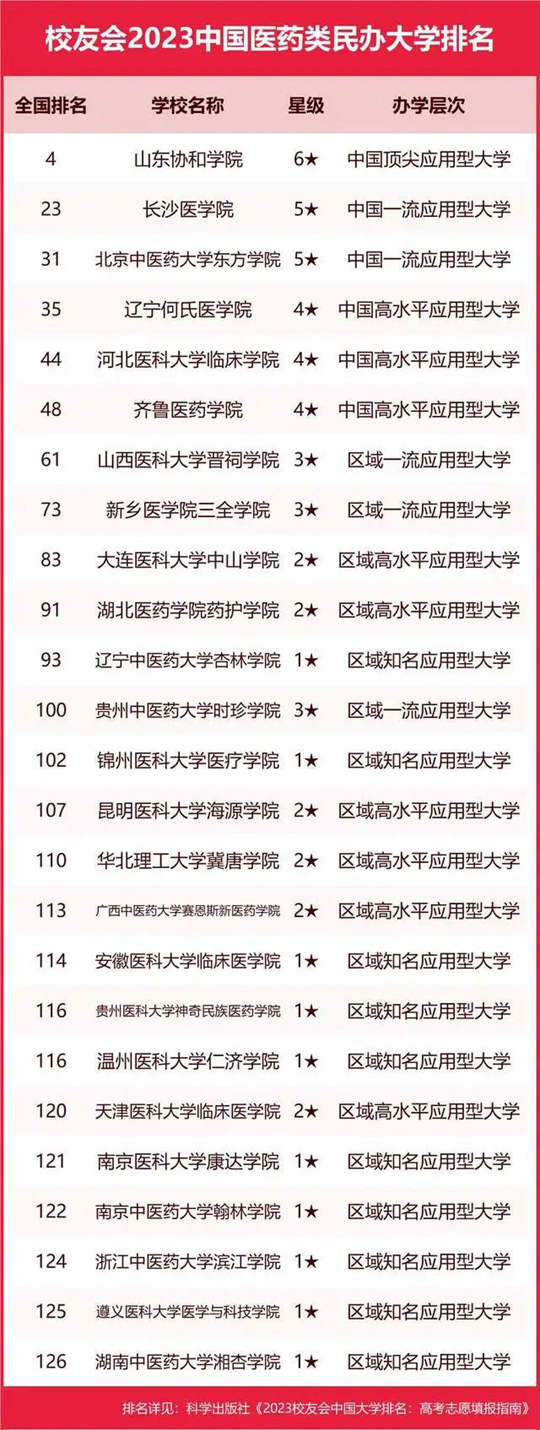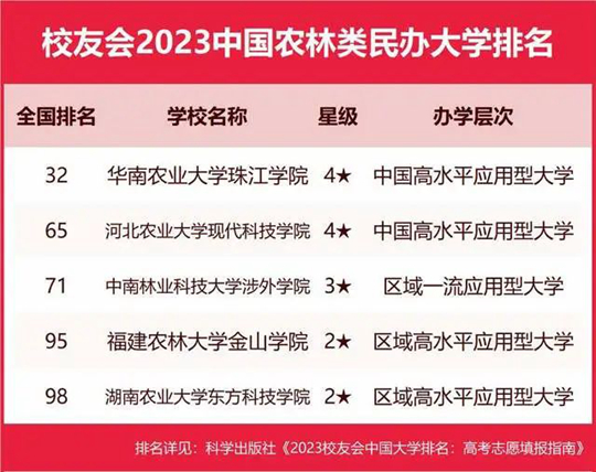武昌首義學(xué)院、三亞學(xué)院、西安歐亞學(xué)院、山東協(xié)和學(xué)院、黑龍江外國語學(xué)院、青島電影學(xué)院、華南農(nóng)業(yè)大學(xué)珠江學(xué)院、南京師范大學(xué)泰州學(xué)院、武漢體育學(xué)院體育科技學(xué)院分列校友會(huì)2023中國理工類、綜合類、財(cái)經(jīng)類、醫(yī)藥類、語言類、藝術(shù)類、農(nóng)林類、師范類和體育類民辦大學(xué)排名第一。