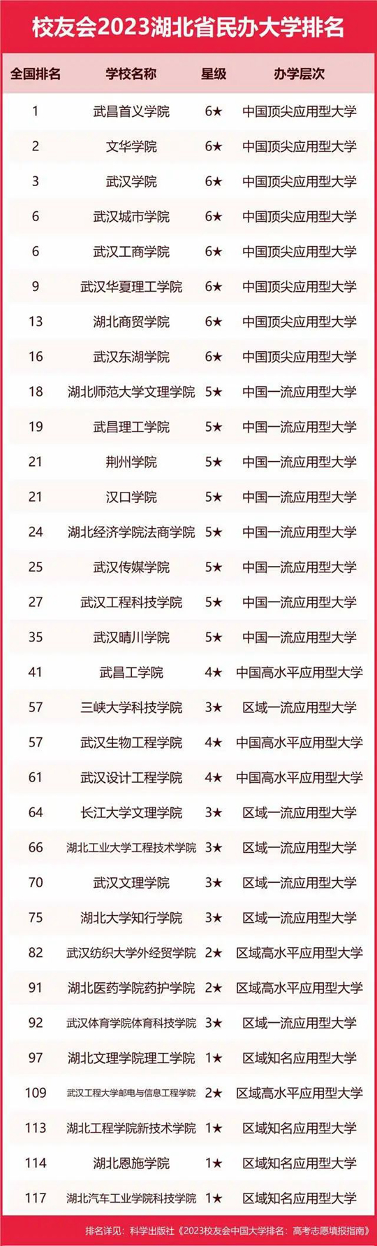 最新校友會(huì)2023中國民辦大學(xué)排名顯示,武昌首義學(xué)院、文華學(xué)院、上海建橋?qū)W院、齊魯理工學(xué)院、南昌理工學(xué)院雄居2023中國民辦大學(xué)排名I類前5強(qiáng)。