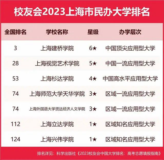 在最新2023中國大學(xué)分類排名中,武昌首義學(xué)院、文華學(xué)院、上海建橋?qū)W院位居2023中國民辦大學(xué)排名I類前3強(qiáng);三亞學(xué)院、廣州南方學(xué)院、四川大學(xué)錦江學(xué)院位列2023中國民辦大學(xué)排名Ⅱ類前3強(qiáng);西安歐亞學(xué)院、昆明城市學(xué)院、武漢學(xué)院位列2023中國民辦大學(xué)排名Ⅲ類前3名。