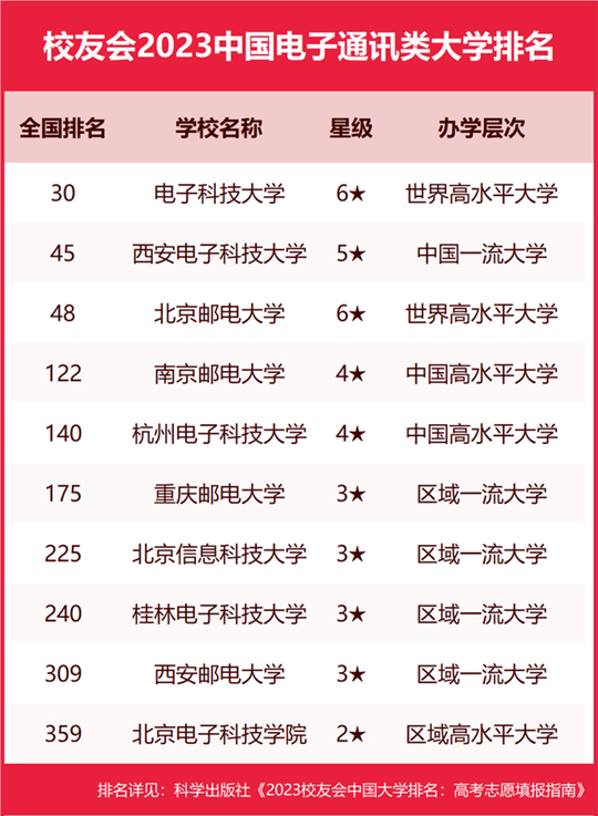 在最新校友會2023中國大學排名中,電子科技大學辦學實力最強、最具競爭力、辦學水平最高,全國排名第30名,榮登校友會2023中國電子通訊類大學排名第一。西安電子科技大學位居全國第45名,名列第2名。北京郵電大學排行全國第48名,排名第3名。南京郵電大學位居全國第122名,位居第4名。杭州電子科技大學位居全國第140名,位居第5名。