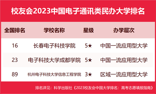 長春電子科技學院問鼎2023中國電子通訊類民辦大學排名首位,杭州電子科技大學信息工程學院前三