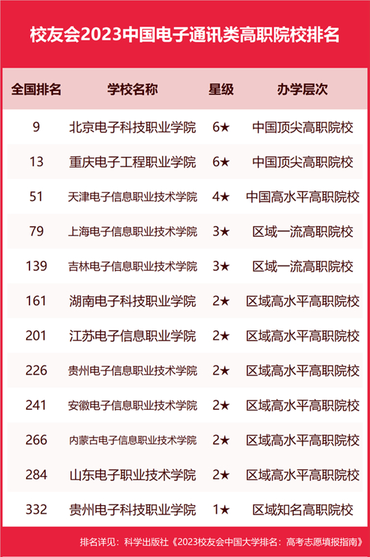 在最新校友會2023中國高職院校排名中,北京電子科技職業(yè)學院辦學水平最高,全國排名第9名,高居校友會2023中國電子通訊類高職院校排名第一。重慶電子工程職業(yè)學院高居全國第13名,位列第2名。天津電子信息職業(yè)技術學院高居全國第51名,位居第3名。上海電子信息職業(yè)技術學院名列全國第79名,高居第4名。吉林電子信息職業(yè)技術學院高居全國第139名,位列第5名。