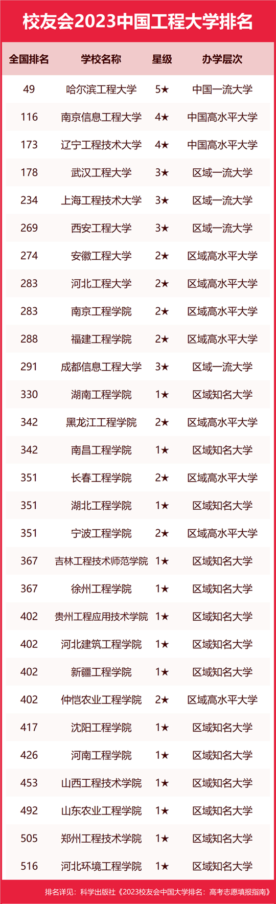 在最新校友會(huì)2023中國(guó)大學(xué)排名中,哈爾濱工程大學(xué)綜合實(shí)力最強(qiáng)、辦學(xué)水平最高、最具競(jìng)爭(zhēng)力,全國(guó)排名第49名,高居校友會(huì)2023中國(guó)工程類大學(xué)排名榜首。南京信息工程大學(xué)高居全國(guó)第116名,名列第2名。遼寧工程技術(shù)大學(xué)位居全國(guó)第173名,排行第3名。武漢工程大學(xué)名列全國(guó)第178名,位列第4名。上海工程技術(shù)大學(xué)高居全國(guó)第234名,排行第5名。