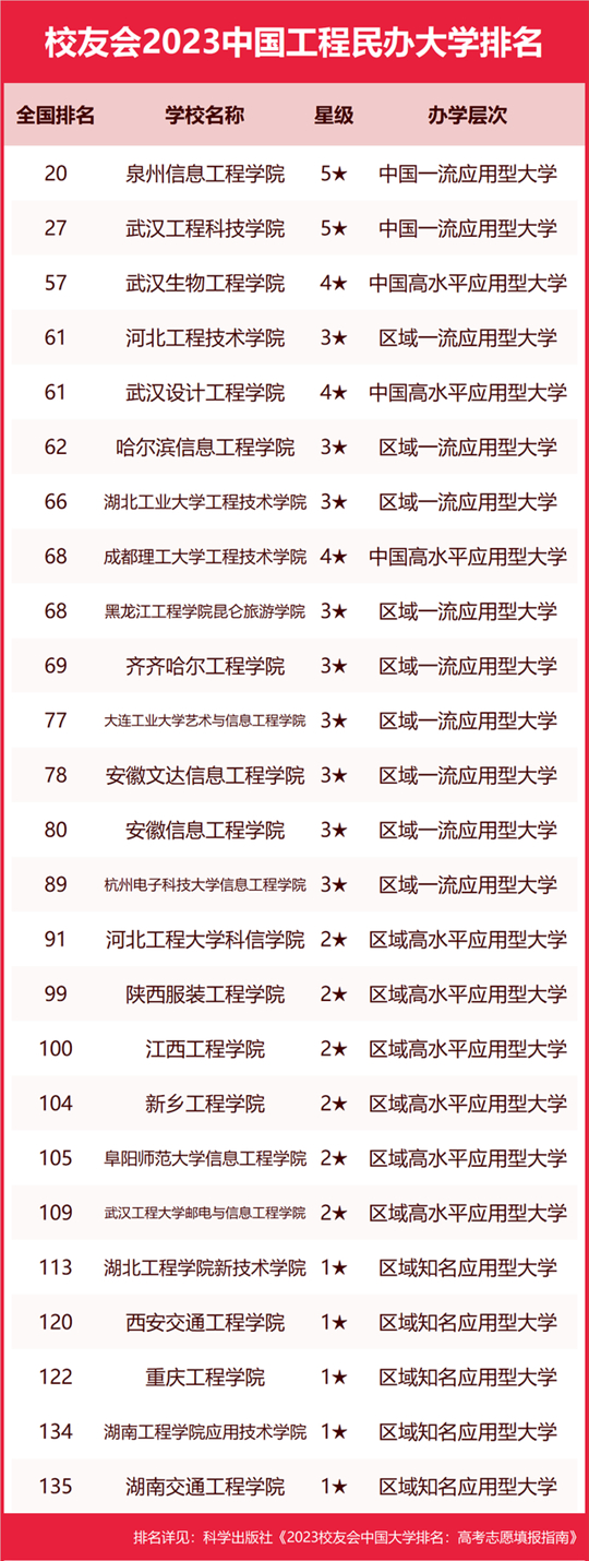 在最新校友會(huì)2023中國(guó)民辦大學(xué)排名中,泉州信息工程學(xué)院辦學(xué)水平最高,全國(guó)排名第20名,高居校友會(huì)2023中國(guó)工程類民辦大學(xué)排名首位。武漢工程科技學(xué)院位列全國(guó)第27名,名列第2名。武漢生物工程學(xué)院名列全國(guó)第57名,排行第3名。武漢設(shè)計(jì)工程學(xué)院、河北工程技術(shù)學(xué)院排名全國(guó)第61名,高居第4名。
