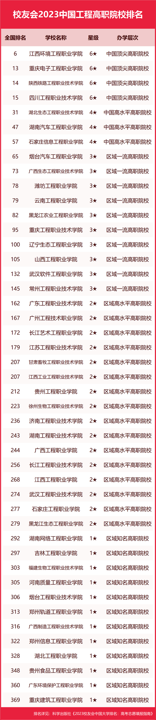 在最新校友會(huì)2023中國(guó)高職院校排名中,江西環(huán)境工程職業(yè)學(xué)院綜合實(shí)力最強(qiáng)、辦學(xué)水平最高、最具競(jìng)爭(zhēng)力,全國(guó)排名第6名,問鼎校友會(huì)2023中國(guó)工程類高職院校排名榜首。重慶電子工程職業(yè)學(xué)院高居全國(guó)第13名,排名第2名。陜西鐵路工程職業(yè)技術(shù)學(xué)院位列全國(guó)第14名,高居第3名。四川工程職業(yè)技術(shù)學(xué)院名列全國(guó)第15名,名列第4名。湖北生態(tài)工程職業(yè)技術(shù)學(xué)院高居全國(guó)第31名,高居第5名。