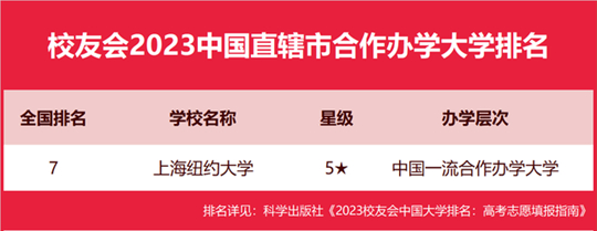 在最新校友會2023中國合作辦學(xué)大學(xué)排名中,上海紐約大學(xué)綜合實(shí)力排名最高、辦學(xué)水平最高,全國排名第7名,位列校友會2023中國直轄市合作辦學(xué)大學(xué)排名第一。