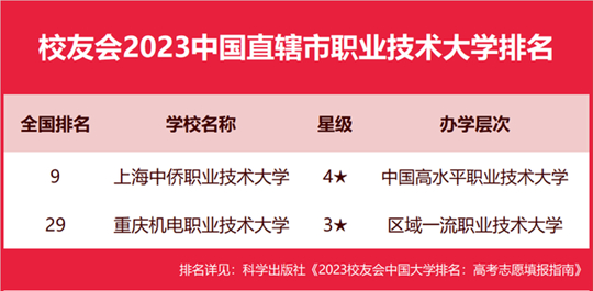 在最新校友會2023中國職業(yè)技術(shù)大學(xué)排名中,上海中僑職業(yè)技術(shù)大學(xué)綜合排名最高、辦學(xué)水平最高,全國排名第9名,奪得校友會2023中國直轄市職業(yè)技術(shù)大學(xué)排名榜首。重慶機(jī)電職業(yè)技術(shù)大學(xué)排名全國第29名,排行第2名。