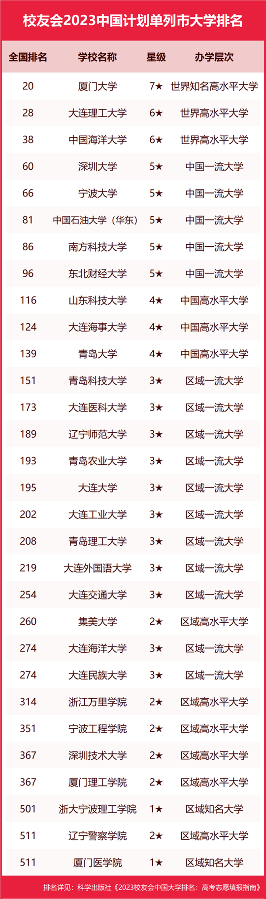 | 校友會(huì)2023中國計(jì)劃單列市大學(xué)排名,廈門大學(xué)、青島電影學(xué)院第一 |