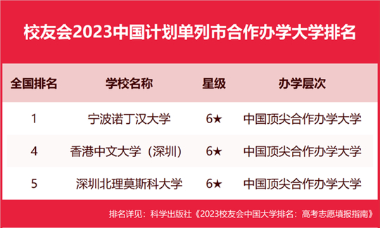 在最新校友會(huì)2023中國合作辦學(xué)大學(xué)排名中,寧波諾丁漢大學(xué)綜合實(shí)力排名最高、辦學(xué)水平最高,全國排名第1名,雄居校友會(huì)2023中國計(jì)劃單列市合作辦學(xué)大學(xué)排名首位。香港中文大學(xué)(深圳)位列全國第4名,排名第2名。深圳北理莫斯科大學(xué)位居全國第5名,位列第3名。