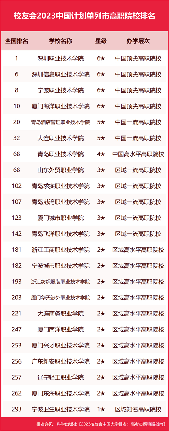 在最新校友會(huì)2023中國高職院校排名中,深圳職業(yè)技術(shù)學(xué)院最具綜合競爭力,全國排名第1名,名列校友會(huì)2023中國計(jì)劃單列市高職院校排名榜首。深圳信息職業(yè)技術(shù)學(xué)院位居全國第6名,高居第2名。寧波職業(yè)技術(shù)學(xué)院高居全國第8名,位列第3名。廈門海洋職業(yè)技術(shù)學(xué)院高居全國第10名,名列第4名。青島酒店管理職業(yè)技術(shù)學(xué)院名列全國第20名,排名第5名。