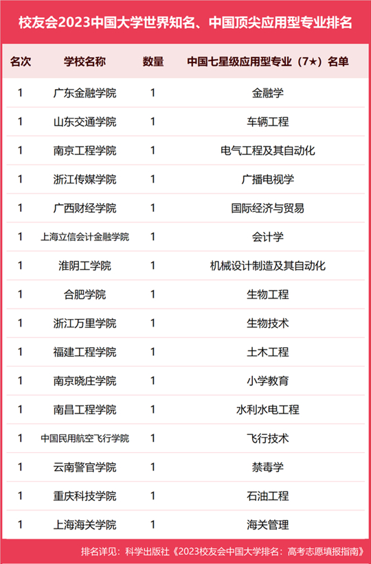 在校友會(huì)2023中國大學(xué)一流專業(yè)排名(應(yīng)用型)中,廣東金融學(xué)院金融學(xué)、山東交通學(xué)院車輛工程、南京工程學(xué)院電氣工程及其自動(dòng)化、浙江傳媒學(xué)院廣播電視學(xué)、廣西財(cái)經(jīng)學(xué)院國際經(jīng)濟(jì)與貿(mào)易、上海立信會(huì)計(jì)金融學(xué)院會(huì)計(jì)學(xué)、淮陰工學(xué)院機(jī)械設(shè)計(jì)制造及其自動(dòng)化、合肥學(xué)院生物工程、浙江萬里學(xué)院生物技術(shù)、福建工程學(xué)院土木工程、南京曉莊學(xué)院小學(xué)教育、南昌工程學(xué)院水利水電工程、中國民用航空飛行學(xué)院飛行技術(shù)、云南警官學(xué)院禁毒學(xué)、重慶科技學(xué)院石油工程、上海海關(guān)學(xué)院海關(guān)管理等16個(gè)本科專業(yè)榮獲2023中國七星級(jí)應(yīng)用型專業(yè)(7★)美譽(yù),挺進(jìn)世界知名、中國頂尖應(yīng)用型專業(yè)行列。