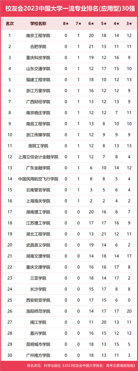在最新校友會(huì)2023中國大學(xué)一流專業(yè)排名(應(yīng)用型)中,南京工程學(xué)院有1個(gè)中國七星級(jí)專業(yè)(7★),20個(gè)中國六星級(jí)專業(yè)(6★),18個(gè)中國五星級(jí)專業(yè)(5★),雄居校友會(huì)2023中國大學(xué)一流專業(yè)排名(應(yīng)用型)榜首,是2023年中國應(yīng)用型本科專業(yè)水平最高、辦學(xué)特色最鮮明的大學(xué)。合肥學(xué)院第2,有1個(gè)中國七星級(jí)專業(yè)(7★),21個(gè)中國六星級(jí)專業(yè)(6★),13個(gè)中國五星級(jí)專業(yè)(5★)。重慶科技學(xué)院第3,有1個(gè)中國七星級(jí)專業(yè)(7★),19個(gè)中國六星級(jí)專業(yè)(6★),12個(gè)中國五星級(jí)專業(yè)(5★)。