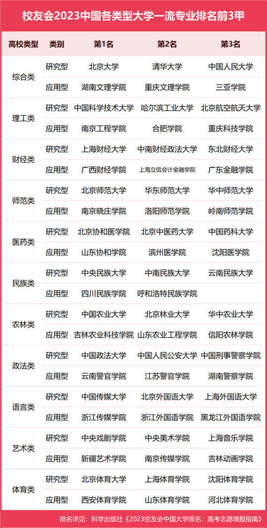 榜單顯示,在最新校友會(huì)2023中國各類型大學(xué)一流專業(yè)排名(研究型)中,北京大學(xué)、中國科學(xué)技術(shù)大學(xué)、北京師范大學(xué)、上海財(cái)經(jīng)大學(xué)、中國農(nóng)業(yè)大學(xué)、北京協(xié)和醫(yī)學(xué)院、北京體育大學(xué)、中國傳媒大學(xué)、中國政法大學(xué)、中央戲劇學(xué)院、中央民族大學(xué)分列綜合類、理工類、師范類、財(cái)經(jīng)類、農(nóng)林類、醫(yī)藥類、體育類、語言類、政法類、藝術(shù)類、民族類大學(xué)第一。