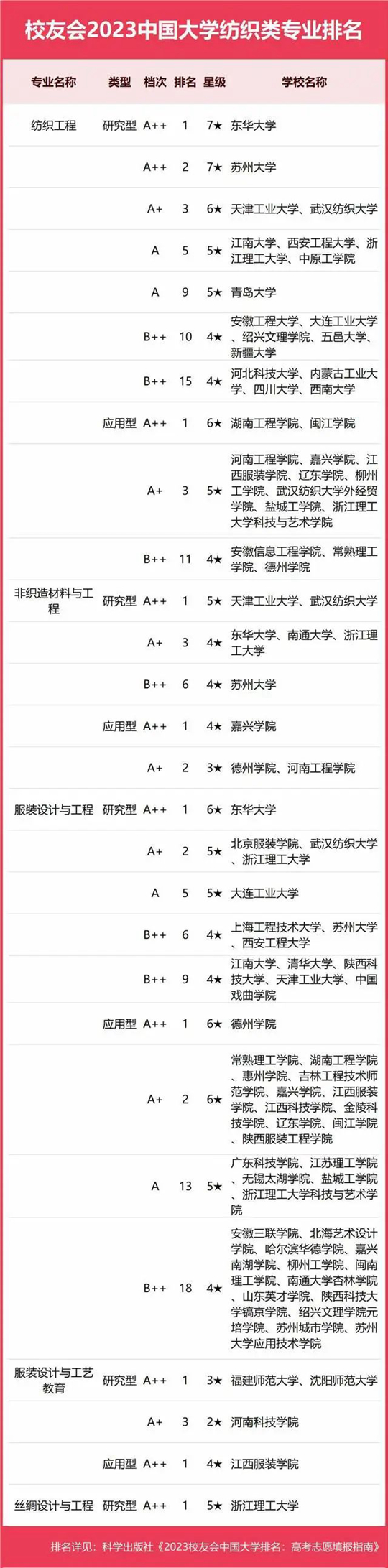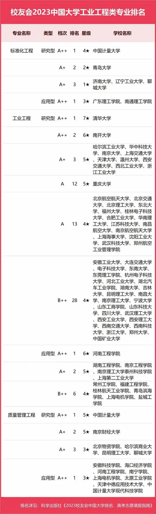 校友會(huì)2023中國大學(xué)一流專業(yè)排名堅(jiān)持實(shí)施分類分級(jí)分檔評(píng)價(jià),依據(jù)中國高校辦學(xué)定位、學(xué)科專業(yè)建設(shè)水平和本科專業(yè)發(fā)展定位,按“研究型”和“應(yīng)用型”2個(gè)類型進(jìn)行評(píng)價(jià)。自2022年起在中國大學(xué)本科專業(yè)星級(jí)評(píng)價(jià)基礎(chǔ)上,開展中國大學(xué)專業(yè)分檔評(píng)價(jià),依據(jù)中國大學(xué)專業(yè)排名位次、位次百分比和星級(jí)排名,將中國大學(xué)本科專業(yè)分為A++、A+、A、B++、B+、B、C和D等8個(gè)檔次。