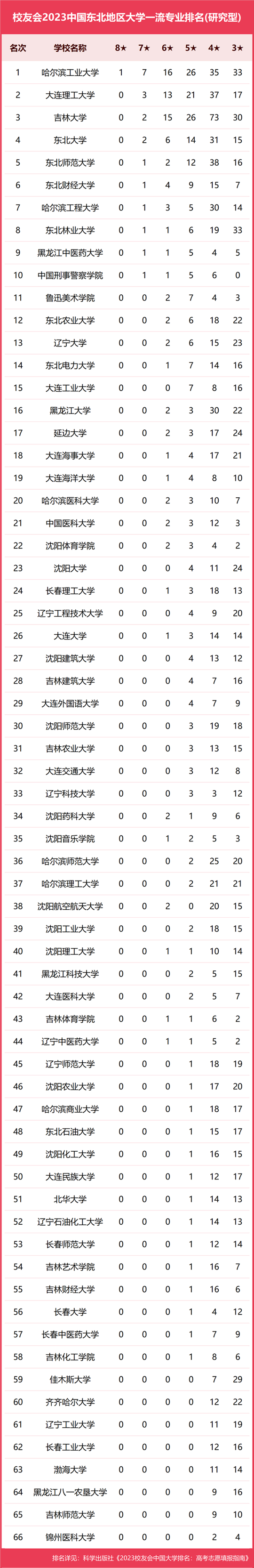榜單顯示,在最新校友會2023中國大學(xué)一流專業(yè)排名(研究型)中,哈爾濱工業(yè)大學(xué)、大連理工大學(xué)、吉林大學(xué)、東北大學(xué)、東北師范大學(xué)雄居校友會2023中國東北地區(qū)大學(xué)專業(yè)排名(研究型)前5強(qiáng)。北京大學(xué)、清華大學(xué)、中國人民大學(xué)、北京師范大學(xué)、南開大學(xué)雄居校友會2023中國華北地區(qū)大學(xué)專業(yè)排名(研究型)前5強(qiáng)。