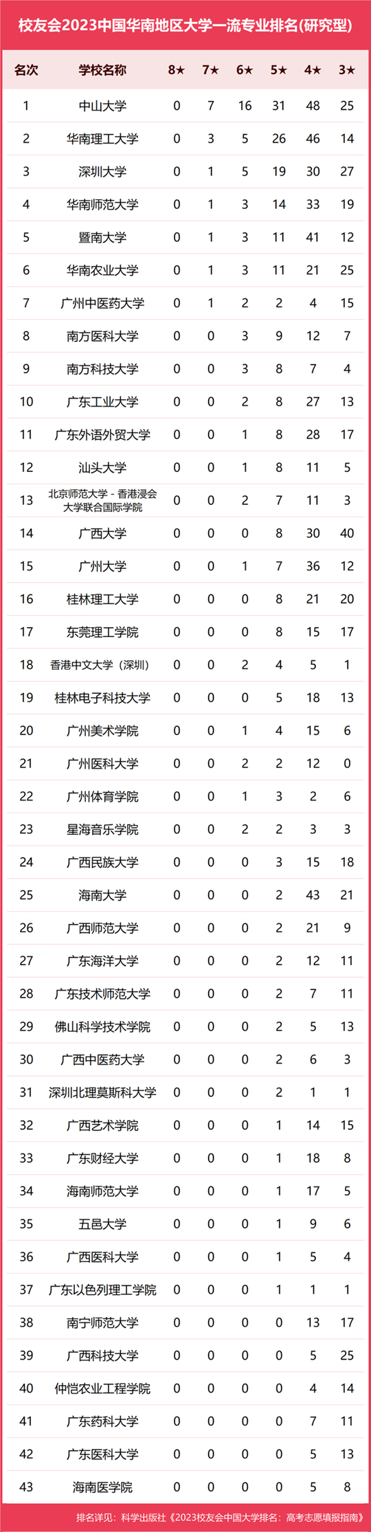 中山大學(xué)、華南理工大學(xué)、深圳大學(xué)、華南師范大學(xué)、暨南大學(xué)雄居校友會2023中國華南地區(qū)大學(xué)專業(yè)排名(研究型)前5強(qiáng)。四川大學(xué)、電子科技大學(xué)、重慶大學(xué)、西南大學(xué)、西南交通大學(xué)雄居校友會2023中國西南地區(qū)大學(xué)專業(yè)排名(研究型)前5強(qiáng)。
