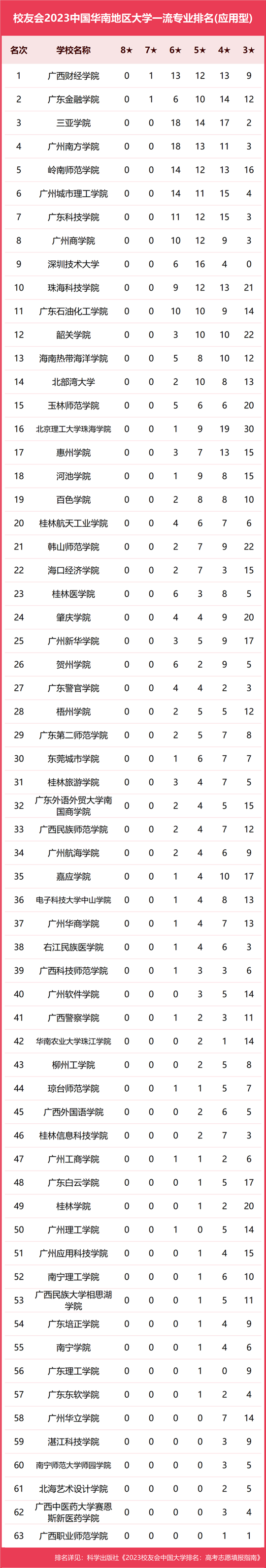 廣西財經(jīng)學(xué)院、廣東金融學(xué)院、三亞學(xué)院、廣州南方學(xué)院、嶺南師范學(xué)院雄居校友會2023中國華南地區(qū)大學(xué)專業(yè)排名(應(yīng)用型)前5強(qiáng)。重慶科技學(xué)院、中國民用航空飛行學(xué)院、云南警官學(xué)院、重慶文理學(xué)院、昆明城市學(xué)院雄居校友會2023中國西南地區(qū)大學(xué)專業(yè)排名(應(yīng)用型)前5強(qiáng)。