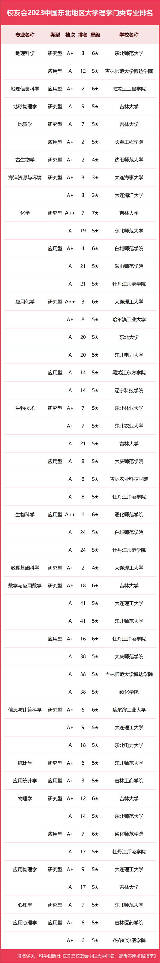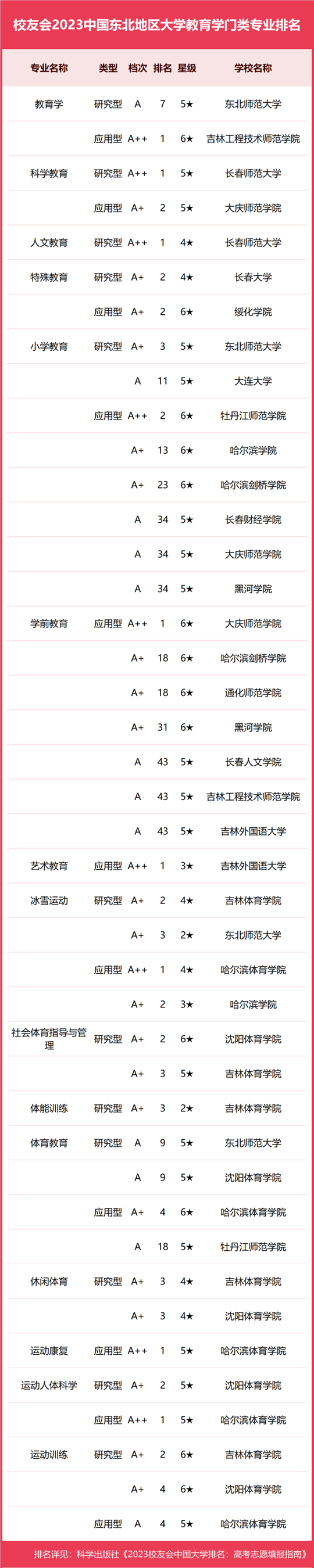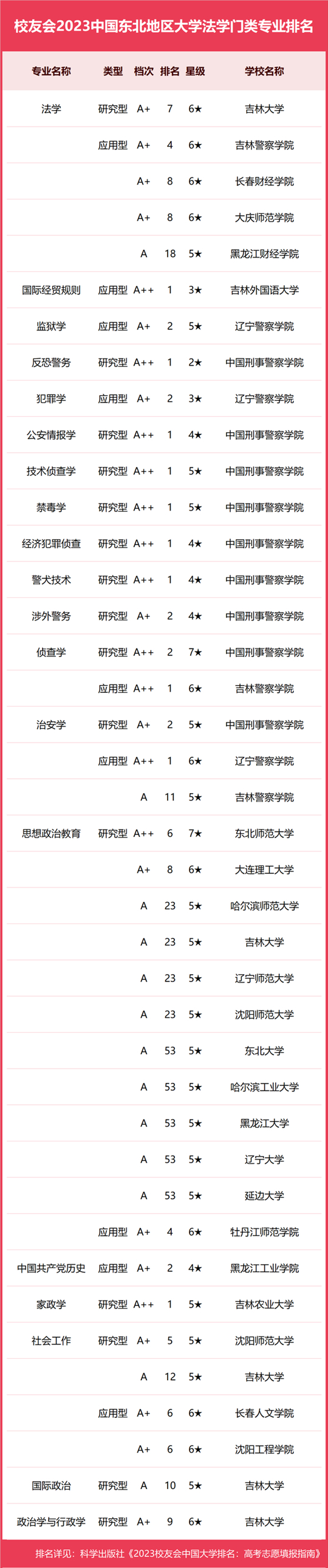 東北大學有2個中國七星級專業(yè)(7★),6個中國六星級專業(yè)(6★),14個中國五星級專業(yè)(5★),31個中國四星級專業(yè)(4★),名列第4名。東北師范大學有1個中國七星級專業(yè)(7★),2個中國六星級專業(yè)(6★),12個中國五星級專業(yè)(5★),38個中國四星級專業(yè)(4★),排行第5名。東北財經(jīng)大學排名第6名。哈爾濱工程大學名列第7名。東北林業(yè)大學排行第8名。黑龍江中醫(yī)藥大學位列第9名。中國刑事警察學院排名第10名。