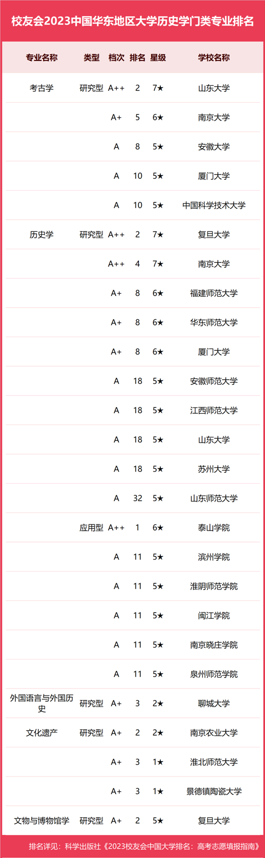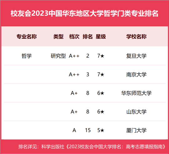 2023年全國(guó)高考即將到來(lái),為了給2023年全國(guó)高考考生及家長(zhǎng)選擇報(bào)考中國(guó)華東地區(qū)高等院校提供參考指南,全國(guó)第三方大學(xué)評(píng)價(jià)機(jī)構(gòu)艾瑞深校友會(huì)網(wǎng)撰寫(xiě)完成、科學(xué)出版社即將出版發(fā)行的《2023校友會(huì)中國(guó)大學(xué)排名:高考志愿填報(bào)指南》最新發(fā)布校友會(huì)2023中國(guó)華東地區(qū)大學(xué)一流專(zhuān)業(yè)排名、2023中國(guó)華東地區(qū)大學(xué)各門(mén)類(lèi)專(zhuān)業(yè)排名。