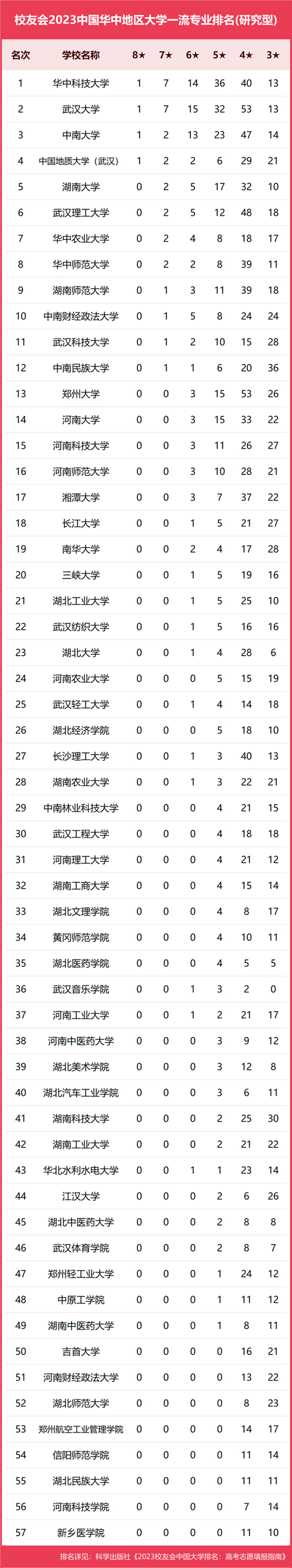 在最新校友會2023中國大學一流專業(yè)排名(研究型)中,華中科技大學專業(yè)實力最強,專業(yè)建設水平最高,有1個中國八星級專業(yè)(8★),7個中國七星級專業(yè)(7★),14個中國六星級專業(yè)(6★),36個中國五星級專業(yè)(5★),40個中國四星級專業(yè)(4★),位居校友會2023中國華中地區(qū)大學一流專業(yè)排名(研究型)第一。武漢大學有1個中國八星級專業(yè)(8★),7個中國七星級專業(yè)(7★),15個中國六星級專業(yè)(6★),32個中國五星級專業(yè)(5★),53個中國四星級專業(yè)(4★),位列第2名。中南大學有1個中國八星級專業(yè)(8★),2個中國七星級專業(yè)(7★),13個中國六星級專業(yè)(6★),23個中國五星級專業(yè)(5★),47個中國四星級專業(yè)(4★),位居第3名。