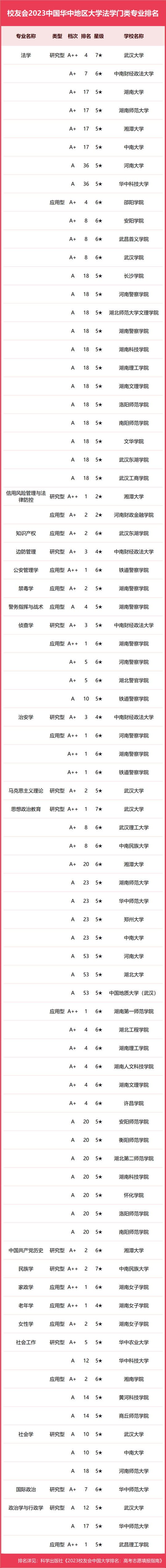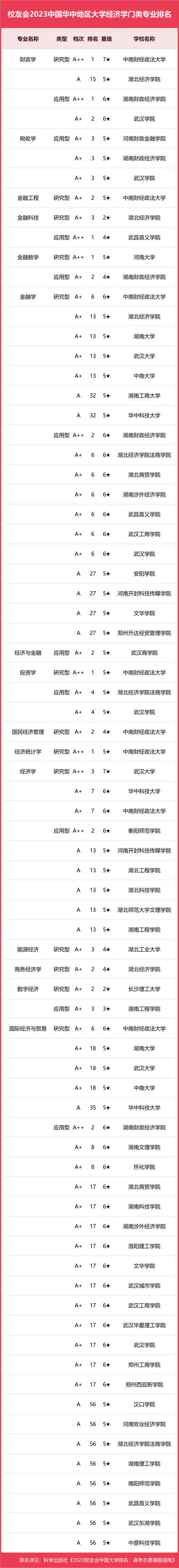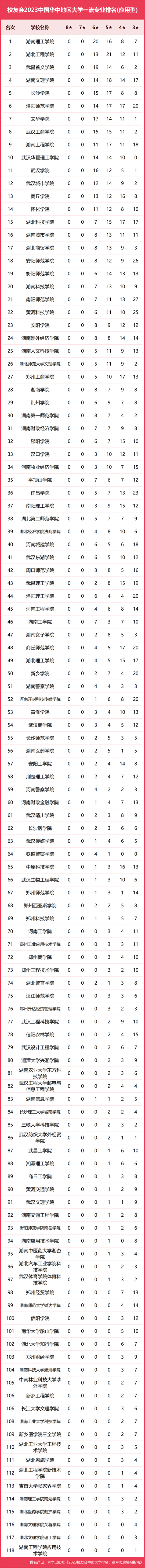 中國地質大學(武漢)有1個中國八星級專業(yè)(8★),2個中國七星級專業(yè)(7★),2個中國六星級專業(yè)(6★),6個中國五星級專業(yè)(5★),29個中國四星級專業(yè)(4★),排名第4名。湖南大學有2個中國七星級專業(yè)(7★),5個中國六星級專業(yè)(6★),17個中國五星級專業(yè)(5★),32個中國四星級專業(yè)(4★),排行第5名。武漢理工大學排行第6名。華中農(nóng)業(yè)大學排名第7名。華中師范大學名列第8名。湖南師范大學排名第9名。中南財經(jīng)政法大學排名第10名。
