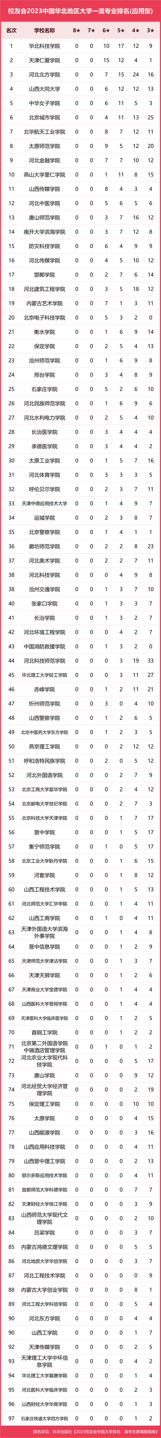 在最新校友會2023中國大學(xué)一流專業(yè)排名(應(yīng)用型)中,華北科技學(xué)院專業(yè)實力最強,專業(yè)水平最高,有10個中國六星級專業(yè)(6★),17個中國五星級專業(yè)(5★),12個中國四星級專業(yè)(4★),名列校友會2023中國華北地區(qū)大學(xué)一流專業(yè)排名(應(yīng)用型)榜首。天津仁愛學(xué)院有15個中國六星級專業(yè)(6★),12個中國五星級專業(yè)(5★),4個中國四星級專業(yè)(4★),高居第2名。河北北方學(xué)院有7個中國六星級專業(yè)(6★),15個中國五星級專業(yè)(5★),24個中國四星級專業(yè)(4★),名列第3名。