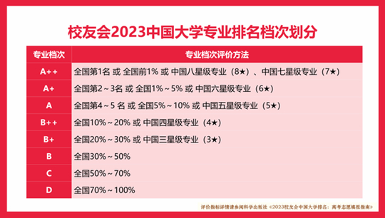 校友會中國大學(xué)一流專業(yè)排名首發(fā)于2015年,至今已有9年的歷史,是目前中國參評高校數(shù)量最多和參評專業(yè)規(guī)模最大的中國大學(xué)本科專業(yè)排名。校友會中國大學(xué)專業(yè)排名堅持實施分類分級分檔評價,按“研究型”和“應(yīng)用型”2個類型進行評價;2022年起,在校友會中國大學(xué)專業(yè)星級評價基礎(chǔ)上,將中國大學(xué)專業(yè)分為A++、A+、A、B++、B+、B、C和D等8個檔次進行評價。