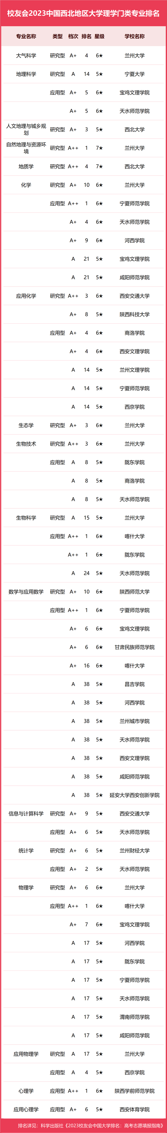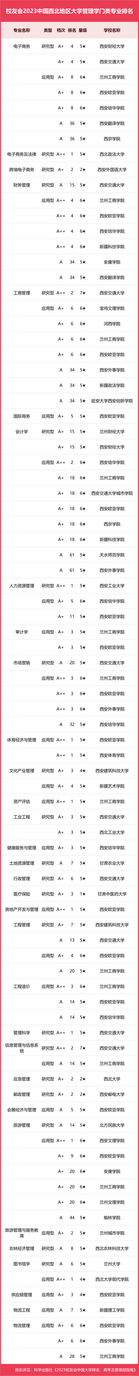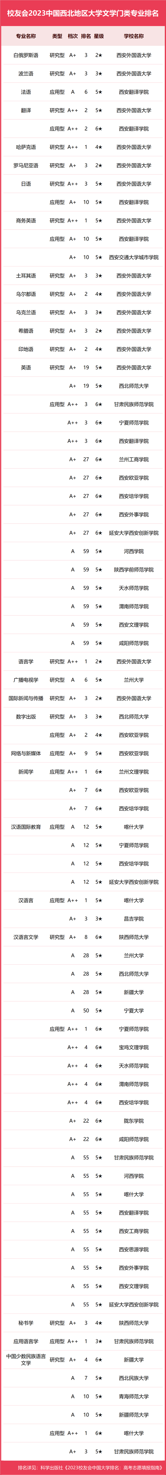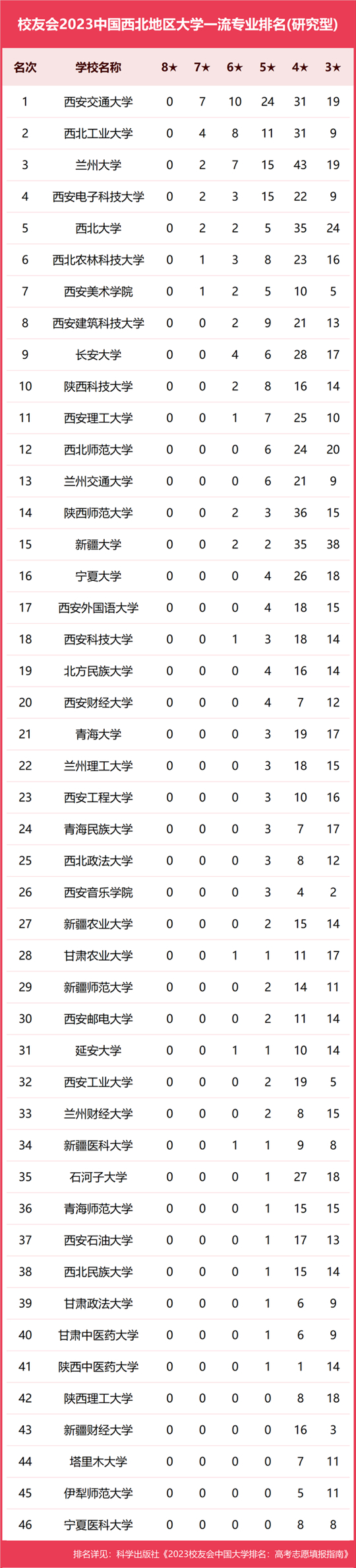 在最新校友會2023中國大學(xué)一流專業(yè)排名(研究型)中,西安交通大學(xué)專業(yè)水平最高,有7個中國七星級專業(yè)(7★),10個中國六星級專業(yè)(6★),24個中國五星級專業(yè)(5★),31個中國四星級專業(yè)(4★),位居校友會2023中國西北地區(qū)大學(xué)一流專業(yè)排名(研究型)冠軍。西北工業(yè)大學(xué)有4個中國七星級專業(yè)(7★),8個中國六星級專業(yè)(6★),11個中國五星級專業(yè)(5★),31個中國四星級專業(yè)(4★),排行第2名。蘭州大學(xué)有2個中國七星級專業(yè)(7★),7個中國六星級專業(yè)(6★),15個中國五星級專業(yè)(5★),43個中國四星級專業(yè)(4★),位居第3名。