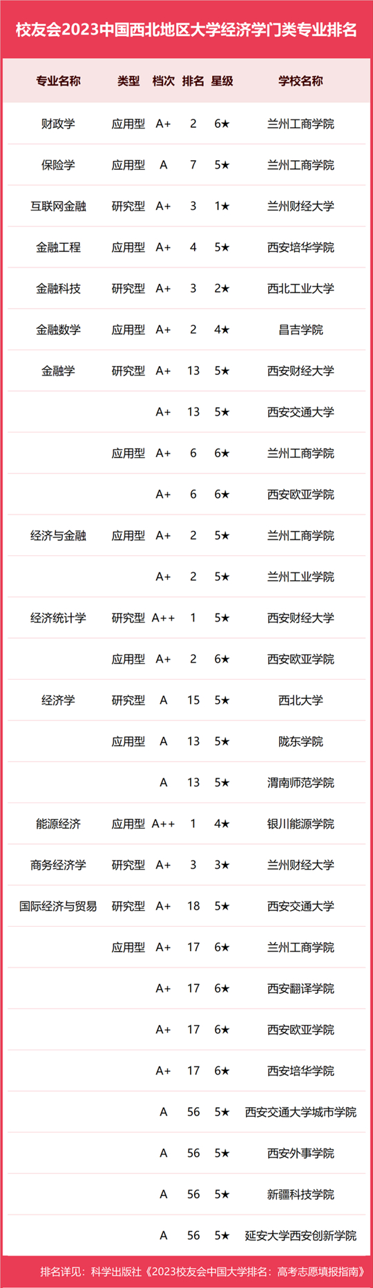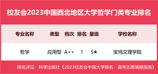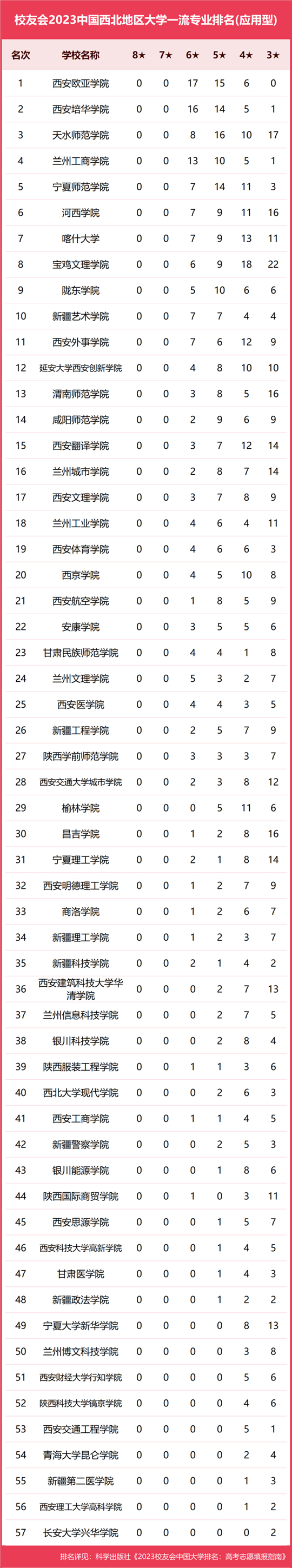 在最新校友會2023中國大學(xué)一流專業(yè)排名(應(yīng)用型)中,西安歐亞學(xué)院專業(yè)實力最強,有17個中國六星級專業(yè)(6★),15個中國五星級專業(yè)(5★),6個中國四星級專業(yè)(4★),高居校友會2023中國西北地區(qū)大學(xué)一流專業(yè)排名(應(yīng)用型)首位。西安培華學(xué)院有16個中國六星級專業(yè)(6★),14個中國五星級專業(yè)(5★),5個中國四星級專業(yè)(4★),排名第2名。天水師范學(xué)院有8個中國六星級專業(yè)(6★),16個中國五星級專業(yè)(5★),10個中國四星級專業(yè)(4★),高居第3名。