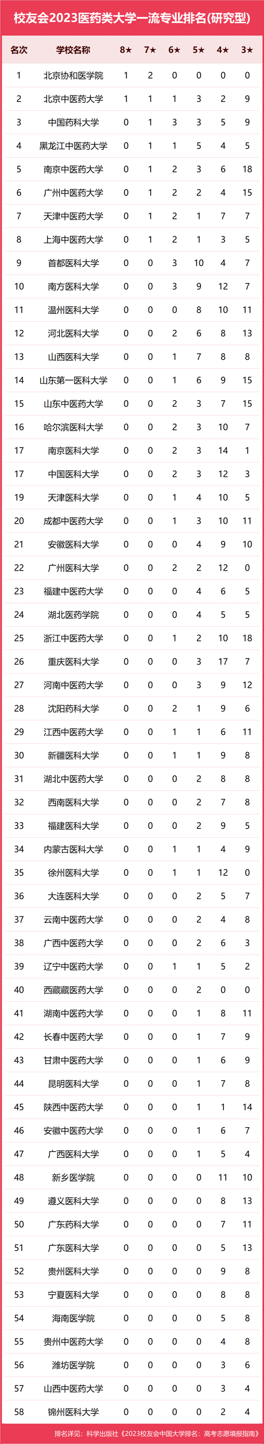 在最新校友會(huì)2023中國大學(xué)一流專業(yè)排名(研究型)中,北京協(xié)和醫(yī)學(xué)院專業(yè)實(shí)力最強(qiáng),有1個(gè)中國八星級(jí)專業(yè)(8★),2個(gè)中國七星級(jí)專業(yè)(7★),高居校友會(huì)2023中國醫(yī)藥類大學(xué)一流專業(yè)排名(研究型)第一。北京中醫(yī)藥大學(xué)有1個(gè)中國八星級(jí)專業(yè)(8★),1個(gè)中國七星級(jí)專業(yè)(7★),1個(gè)中國六星級(jí)專業(yè)(6★),3個(gè)中國五星級(jí)專業(yè)(5★),2個(gè)中國四星級(jí)專業(yè)(4★),排名第2名。中國藥科大學(xué)有1個(gè)中國七星級(jí)專業(yè)(7★),3個(gè)中國六星級(jí)專業(yè)(6★),3個(gè)中國五星級(jí)專業(yè)(5★),5個(gè)中國四星級(jí)專業(yè)(4★),排名第3名。黑龍江中醫(yī)藥大學(xué)有1個(gè)中國七星級(jí)專業(yè)(7★),1個(gè)中國六星級(jí)專業(yè)(6★),5個(gè)中國五星級(jí)專業(yè)(5★),4個(gè)中國四星級(jí)專業(yè)(4★),位居第4名。南京中醫(yī)藥大學(xué)有1個(gè)中國七星級(jí)專業(yè)(7★),2個(gè)中國六星級(jí)專業(yè)(6★),3個(gè)中國五星級(jí)專業(yè)(5★),6個(gè)中國四星級(jí)專業(yè)(4★),名列第5名。廣州中醫(yī)藥大學(xué)排行第6名。天津中醫(yī)藥大學(xué)排名第7名。上海中醫(yī)藥大學(xué)排行第8名。首都醫(yī)科大學(xué)位居第9名。南方醫(yī)科大學(xué)高居第10名。