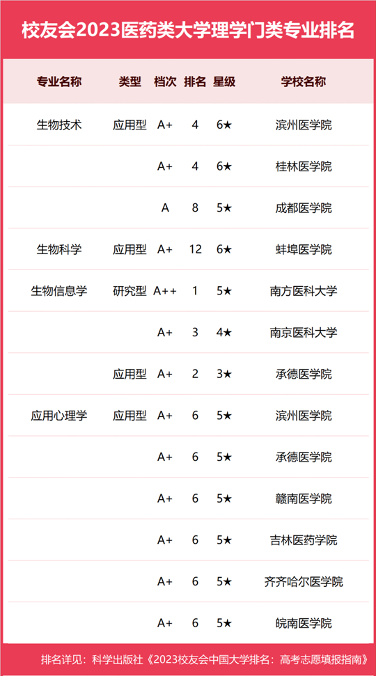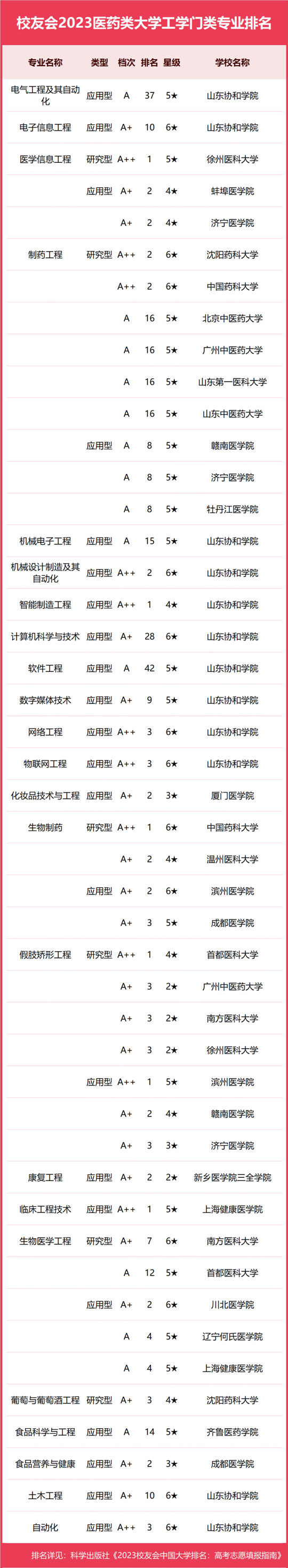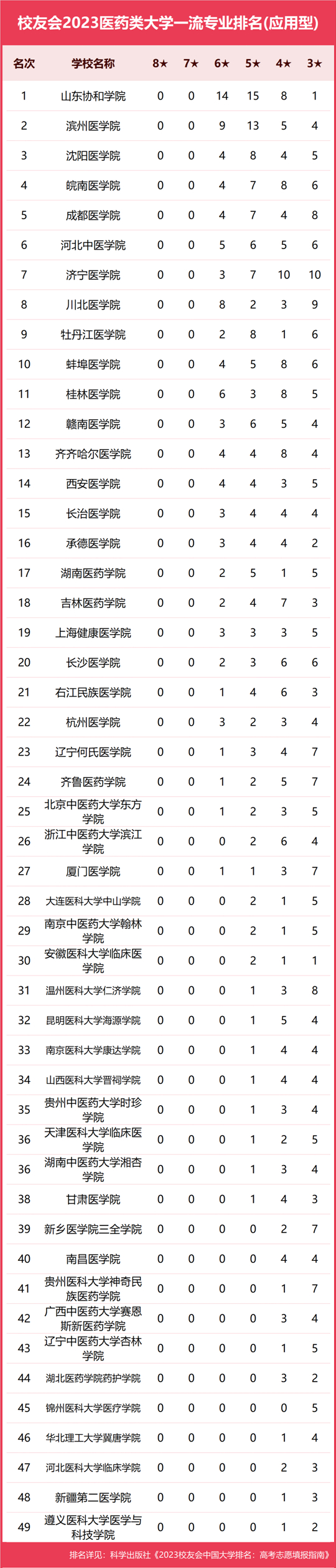在最新校友會(huì)2023中國大學(xué)一流專業(yè)排名(應(yīng)用型)中,山東協(xié)和學(xué)院專業(yè)實(shí)力最強(qiáng),有14個(gè)中國六星級(jí)專業(yè)(6★),15個(gè)中國五星級(jí)專業(yè)(5★),8個(gè)中國四星級(jí)專業(yè)(4★),位居校友會(huì)2023中國醫(yī)藥類大學(xué)一流專業(yè)排名(應(yīng)用型)第一。濱州醫(yī)學(xué)院有9個(gè)中國六星級(jí)專業(yè)(6★),13個(gè)中國五星級(jí)專業(yè)(5★),5個(gè)中國四星級(jí)專業(yè)(4★),名列第2名。沈陽醫(yī)學(xué)院有4個(gè)中國六星級(jí)專業(yè)(6★),8個(gè)中國五星級(jí)專業(yè)(5★),4個(gè)中國四星級(jí)專業(yè)(4★),位列第3名。皖南醫(yī)學(xué)院有4個(gè)中國六星級(jí)專業(yè)(6★),7個(gè)中國五星級(jí)專業(yè)(5★),8個(gè)中國四星級(jí)專業(yè)(4★),排名第4名。成都醫(yī)學(xué)院有4個(gè)中國六星級(jí)專業(yè)(6★),7個(gè)中國五星級(jí)專業(yè)(5★),4個(gè)中國四星級(jí)專業(yè)(4★),位列第5名。河北中醫(yī)學(xué)院排名第6名。濟(jì)寧醫(yī)學(xué)院位居第7名。川北醫(yī)學(xué)院高居第8名。牡丹江醫(yī)學(xué)院高居第9名。蚌埠醫(yī)學(xué)院名列第10名。