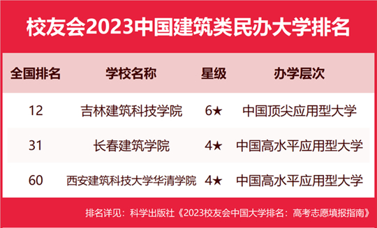 在最新校友會2023中國民辦大學(xué)排名中,吉林建筑科技學(xué)院辦學(xué)實力最強、最具競爭力、辦學(xué)水平最高,全國排名第12名,穩(wěn)居校友會2023中國建筑類民辦大學(xué)排名榜首。長春建筑學(xué)院排名全國第31名,排名第2名。西安建筑科技大學(xué)華清學(xué)院排名全國第60名,排名第3名。