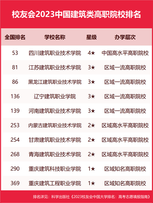 在最新校友會2023中國高職院校排名中,四川建筑職業(yè)技術(shù)學(xué)院實力最強,全國排名第53名,雄居校友會2023中國建筑類高職院校排名第一。江蘇建筑職業(yè)技術(shù)學(xué)院排名全國第81名,排行第2名。黑龍江建筑職業(yè)技術(shù)學(xué)院名列全國第86名,排名第3名。遼寧建筑職業(yè)學(xué)院高居全國第136名,位列第4名。河南建筑職業(yè)技術(shù)學(xué)院位居全國第139名,排名第5名。
