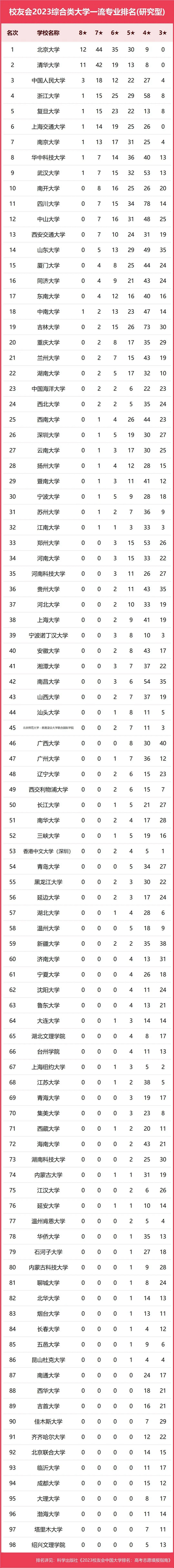 在最新校友會(huì)2023中國(guó)大學(xué)一流專業(yè)排名(研究型)中,北京大學(xué)專業(yè)實(shí)力最強(qiáng),專業(yè)水平最高,有12個(gè)中國(guó)八星級(jí)專業(yè)(8★),44個(gè)中國(guó)七星級(jí)專業(yè)(7★),35個(gè)中國(guó)六星級(jí)專業(yè)(6★),30個(gè)中國(guó)五星級(jí)專業(yè)(5★),9個(gè)中國(guó)四星級(jí)專業(yè)(4★),勇奪校友會(huì)2023中國(guó)綜合類大學(xué)一流專業(yè)排名(研究型)首位。清華大學(xué)有11個(gè)中國(guó)八星級(jí)專業(yè)(8★),42個(gè)中國(guó)七星級(jí)專業(yè)(7★),19個(gè)中國(guó)六星級(jí)專業(yè)(6★),13個(gè)中國(guó)五星級(jí)專業(yè)(5★),8個(gè)中國(guó)四星級(jí)專業(yè)(4★),位列第2名。中國(guó)人民大學(xué)有3個(gè)中國(guó)八星級(jí)專業(yè)(8★),18個(gè)中國(guó)七星級(jí)專業(yè)(7★),12個(gè)中國(guó)六星級(jí)專業(yè)(6★),22個(gè)中國(guó)五星級(jí)專業(yè)(5★),27個(gè)中國(guó)四星級(jí)專業(yè)(4★),位列第3名。