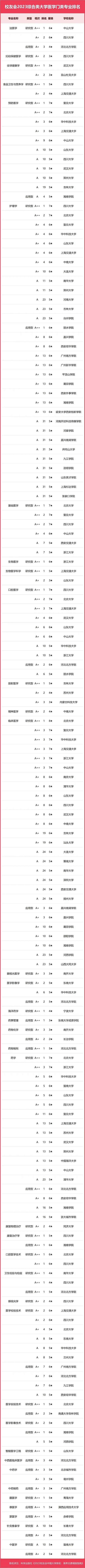 浙江大學(xué)有1個(gè)中國(guó)八星級(jí)專業(yè)(8★),15個(gè)中國(guó)七星級(jí)專業(yè)(7★),25個(gè)中國(guó)六星級(jí)專業(yè)(6★),29個(gè)中國(guó)五星級(jí)專業(yè)(5★),58個(gè)中國(guó)四星級(jí)專業(yè)(4★),位列第4名。復(fù)旦大學(xué)有1個(gè)中國(guó)八星級(jí)專業(yè)(8★),15個(gè)中國(guó)七星級(jí)專業(yè)(7★),23個(gè)中國(guó)六星級(jí)專業(yè)(6★),22個(gè)中國(guó)五星級(jí)專業(yè)(5★),13個(gè)中國(guó)四星級(jí)專業(yè)(4★),排名第5名。上海交通大學(xué)位列第6名。南京大學(xué)排行第7名。華中科技大學(xué)高居第8名。武漢大學(xué)高居第9名。南開大學(xué)排行第10名。