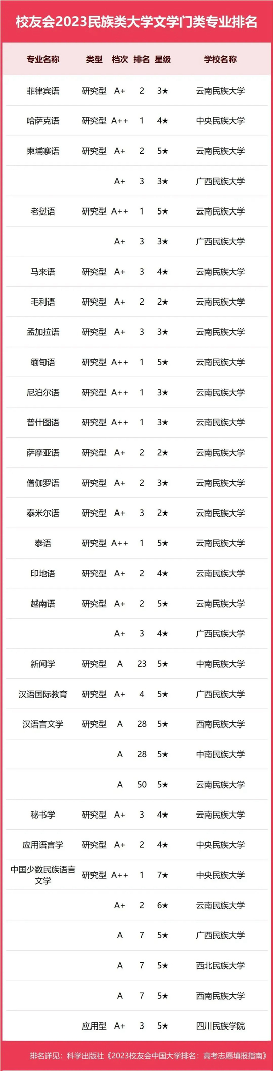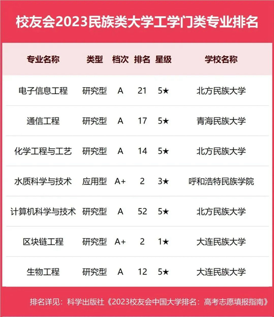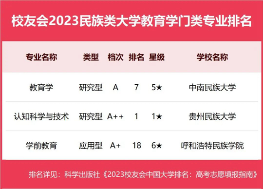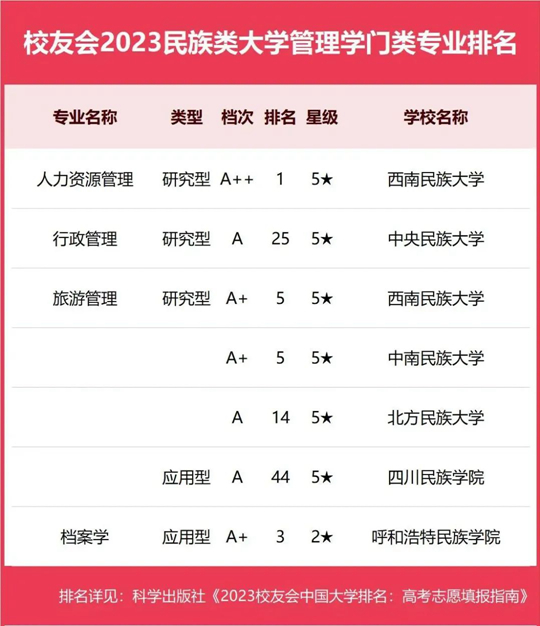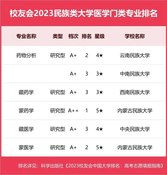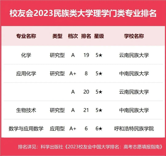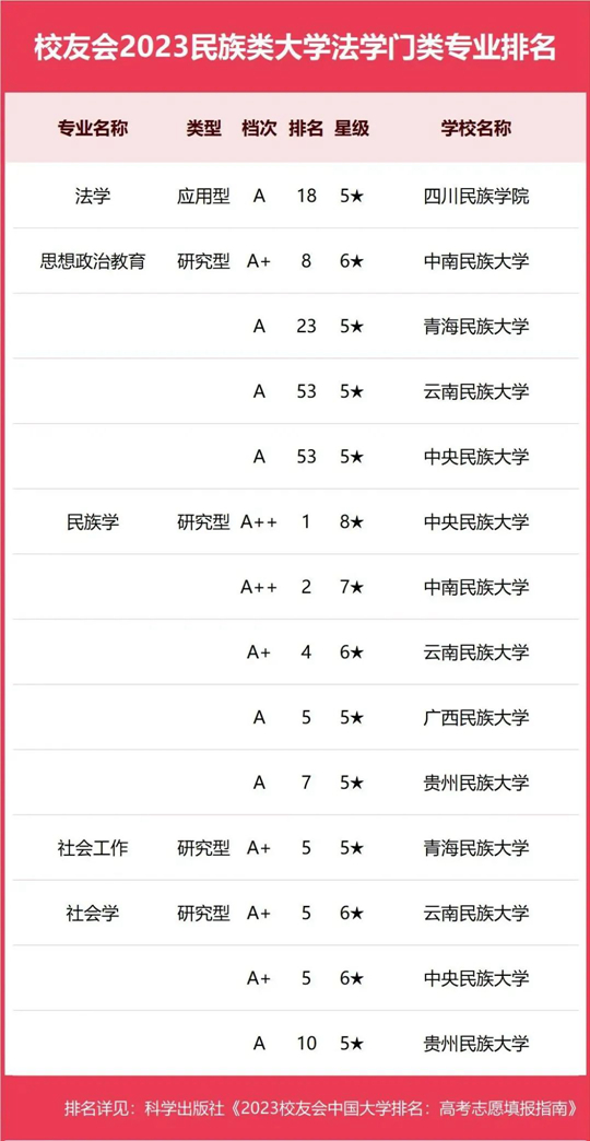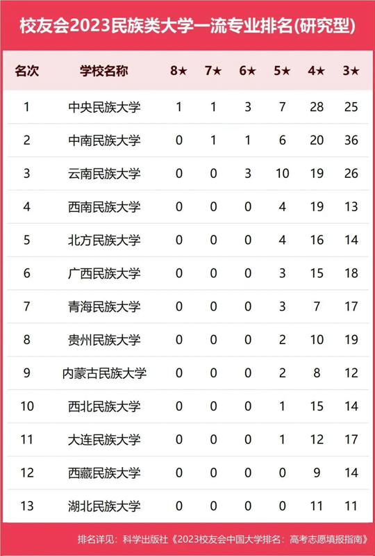 2023年全國(guó)高考即將到來,為了給2023年全國(guó)高考考生及家長(zhǎng)選擇報(bào)考中國(guó)民族類高等院校提供參考指南,全國(guó)第三方大學(xué)評(píng)價(jià)機(jī)構(gòu)艾瑞深校友會(huì)網(wǎng)撰寫完成、科學(xué)出版社即將出版發(fā)行的《2023校友會(huì)中國(guó)大學(xué)排名:高考志愿填報(bào)指南》最新發(fā)布校友會(huì)2023中國(guó)民族類大學(xué)一流專業(yè)排名、2023中國(guó)民族類大學(xué)各門類專業(yè)排名。