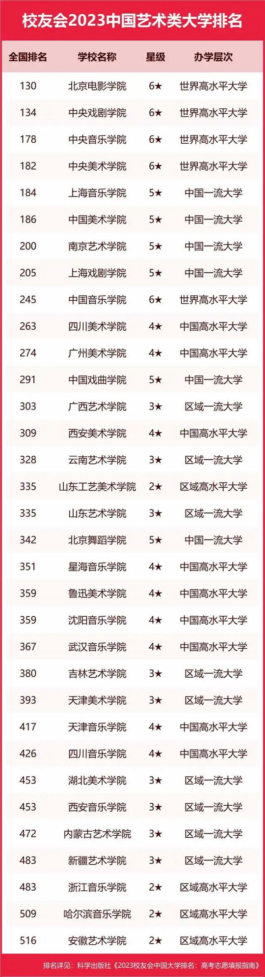 為了給2023年全國高考考生和家長選擇填報中國藝術(shù)類大學提供報考指南,2023年4月6日,全國第三方大學評價機構(gòu)艾瑞深校友會網(wǎng)撰寫完成、科學出版社即將出版的《2023校友會中國大學排名:高考志愿填報指南》最新發(fā)布校友會2023中國藝術(shù)類大學排名。