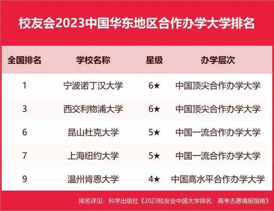 在最新校友會2023中國合作辦學(xué)大學(xué)排名中,寧波諾丁漢大學(xué)最具綜合競爭力,全國排名第1名,雄居校友會2023中國華東地區(qū)合作辦學(xué)大學(xué)排名第一。西交利物浦大學(xué)排行全國第3名,位列第2名。昆山杜克大學(xué)排行全國第6名,名列第3名。上海紐約大學(xué)排行全國第7名,位列第4名。溫州肯恩大學(xué)高居全國第9名,高居第5名。