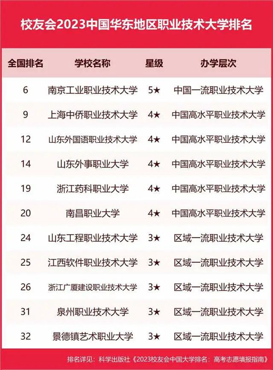 在最新校友會2023中國職業(yè)技術(shù)大學(xué)排名中,南京工業(yè)職業(yè)技術(shù)大學(xué)綜合實(shí)力排名最高、辦學(xué)水平最高,全國排名第6名,奪得校友會2023中國華東地區(qū)職業(yè)技術(shù)大學(xué)排名第一。上海中僑職業(yè)技術(shù)大學(xué)位居全國第9名,排名第2名。山東外國語職業(yè)技術(shù)大學(xué)位列全國第12名,高居第3名。山東外事職業(yè)大學(xué)名列全國第14名,位居第4名。浙江藥科職業(yè)大學(xué)排名全國第19名,位列第5名。南昌職業(yè)大學(xué)位居全國第20名,位居第6名。山東工程職業(yè)技術(shù)大學(xué)排行全國第24名,排行第7名。江西軟件職業(yè)技術(shù)大學(xué)位居全國第25名,排行第8名。浙江廣廈建設(shè)職業(yè)技術(shù)大學(xué)排名全國第26名,排名第9名。泉州職業(yè)技術(shù)大學(xué)位列全國第31名,位居第10名。
