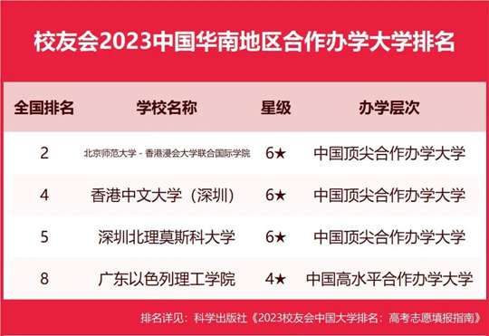 在最新校友會(huì)2023中國(guó)合作辦學(xué)大學(xué)排名中,北京師范大學(xué)-香港浸會(huì)大學(xué)聯(lián)合國(guó)際學(xué)院實(shí)力最強(qiáng),全國(guó)排名第2名,勇奪校友會(huì)2023中國(guó)華南地區(qū)合作辦學(xué)大學(xué)排名冠軍。香港中文大學(xué)(深圳)位居全國(guó)第4名,位居第2名。深圳北理莫斯科大學(xué)高居全國(guó)第5名,名列第3名。廣東以色列理工學(xué)院名列全國(guó)第8名,位列第4名。