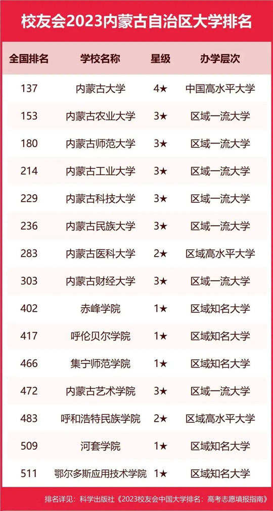 為了給2023年全國高考考生和家長選擇填報內蒙古自治區(qū)高校提供報考指南,2023年4月6日,全國第三方大學評價機構艾瑞深校友會網(wǎng)撰寫完成、科學出版社即將出版發(fā)行的《2023校友會中國大學排名:高考志愿填報指南》最新發(fā)布校友會2023內蒙古自治區(qū)大學排名。