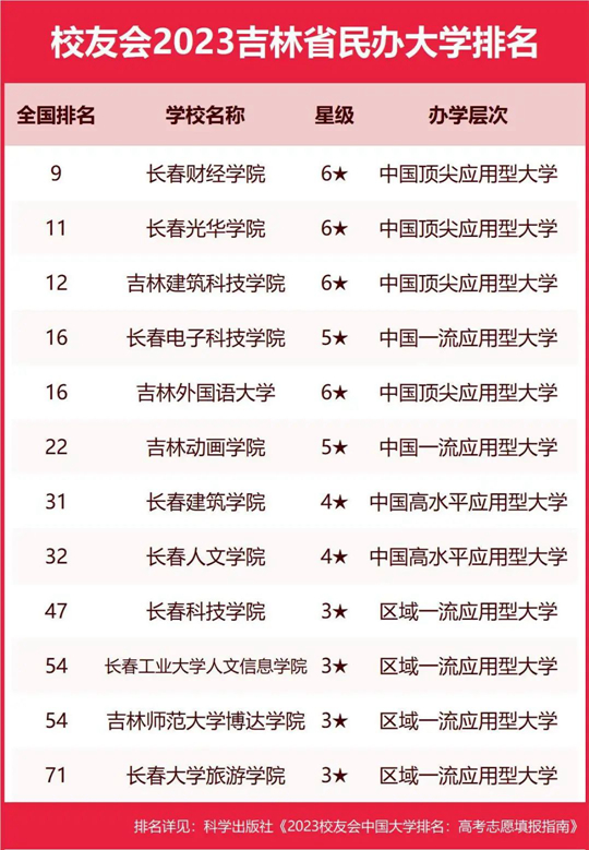 在最新校友會(huì)2023中國(guó)民辦大學(xué)排名中,長(zhǎng)春財(cái)經(jīng)學(xué)院綜合實(shí)力最強(qiáng)、辦學(xué)水平最高、最具競(jìng)爭(zhēng)力,全國(guó)排名第9名,奪得校友會(huì)2023吉林省民辦大學(xué)排名榜首。長(zhǎng)春光華學(xué)院排行全國(guó)第11名,位列第2名。吉林建筑科技學(xué)院位居全國(guó)第12名,名列第3名。吉林外國(guó)語(yǔ)大學(xué)、長(zhǎng)春電子科技學(xué)院排名全國(guó)第16名,位列第4名。