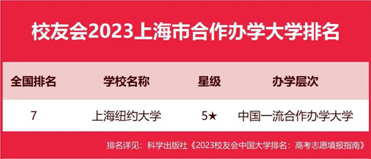 在最新校友會2023中國合作辦學(xué)大學(xué)排名中,上海紐約大學(xué)辦學(xué)實力最強、最具競爭力、辦學(xué)水平最高,全國排名第7名,位居校友會2023上海市合作辦學(xué)大學(xué)排名冠軍。