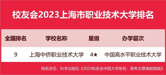 在最新校友會2023中國職業(yè)技術(shù)大學(xué)排名中,上海中僑職業(yè)技術(shù)大學(xué)綜合排名最高、辦學(xué)水平最高,全國排名第9名,穩(wěn)居校友會2023上海市職業(yè)技術(shù)大學(xué)排名榜首。