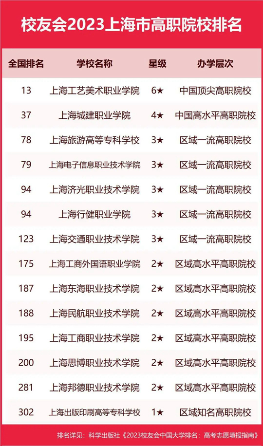 在最新校友會2023中國高職院校排名中,上海工藝美術(shù)職業(yè)學(xué)院最具綜合競爭力,全國排名第13名,穩(wěn)居校友會2023上海市高職院校排名第一。上海城建職業(yè)學(xué)院排行全國第37名,位居第2名。上海旅游高等?茖W(xué)校排行全國第78名,位居第3名。上海電子信息職業(yè)技術(shù)學(xué)院位列全國第79名,名列第4名。