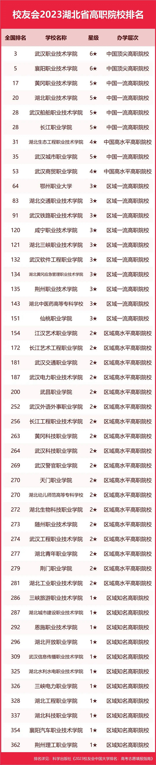 在最新校友會2023中國高職院校排名中,武漢職業(yè)技術(shù)學(xué)院綜合實力最強、辦學(xué)水平最高、最具競爭力,全國排名第3名,高居校友會2023湖北省高職院校排名第一。襄陽職業(yè)技術(shù)學(xué)院位居全國第5名,排名第2名。黃岡職業(yè)技術(shù)學(xué)院名列全國第17名,名列第3名。湖北職業(yè)技術(shù)學(xué)院名列全國第20名,排行第4名。武漢船舶職業(yè)技術(shù)學(xué)院、長江職業(yè)學(xué)院位列全國第28名,位列第5名。