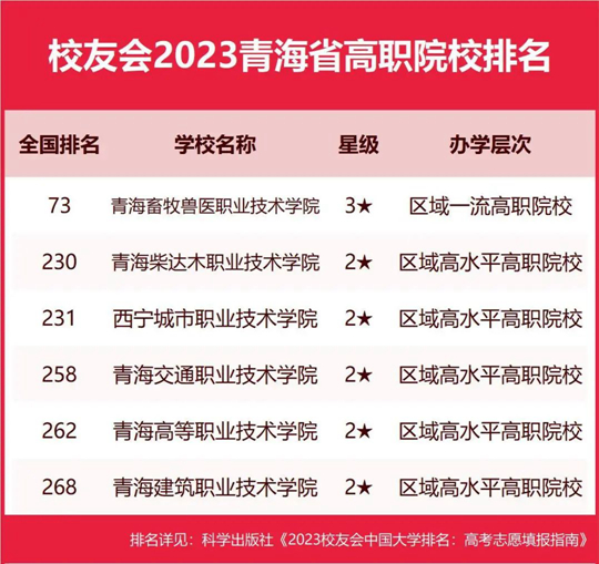 在最新校友會(huì)2023中國(guó)高職院校排名中,青海畜牧獸醫(yī)職業(yè)技術(shù)學(xué)院綜合排名最高、辦學(xué)水平最高,全國(guó)排名第73名,勇奪校友會(huì)2023青海省高職院校排名首位。青海柴達(dá)木職業(yè)技術(shù)學(xué)院位列全國(guó)第230名,名列第2名。西寧城市職業(yè)技術(shù)學(xué)院排名全國(guó)第231名,高居第3名。青海交通職業(yè)技術(shù)學(xué)院名列全國(guó)第258名,排行第4名。青海高等職業(yè)技術(shù)學(xué)院高居全國(guó)第262名,名列第5名。青海建筑職業(yè)技術(shù)學(xué)院高居全國(guó)第268名,位居第6名。