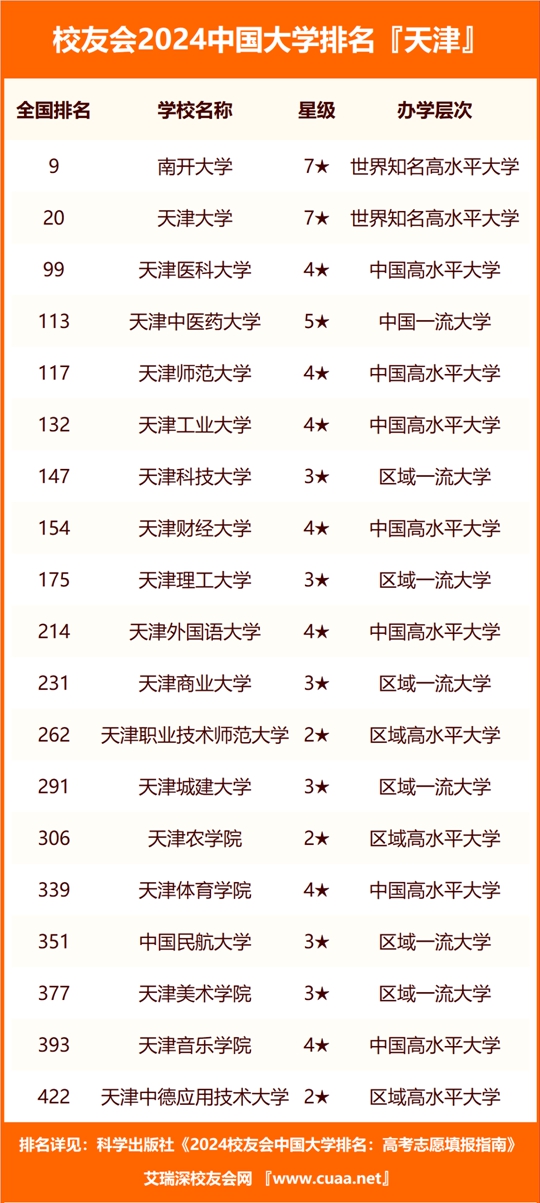 為給2024年全國高考考生選擇填報天津市高校提供參考,2024年1月16日,全國第三方大學(xué)評價機構(gòu)艾瑞深校友會網(wǎng)(Cuaa.net)正式公布《2024校友會中國大學(xué)排名:高考志愿填報指南》,發(fā)布最新校友會2024天津市大學(xué)排名,該書將由科學(xué)出版社公開出版發(fā)行。