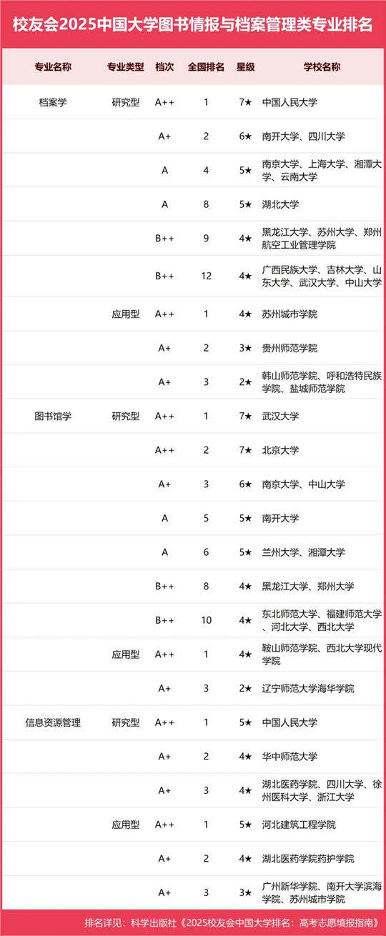 校友會(huì)2025中國(guó)大學(xué)圖書情報(bào)與檔案管理類專業(yè)排名(應(yīng)用型)