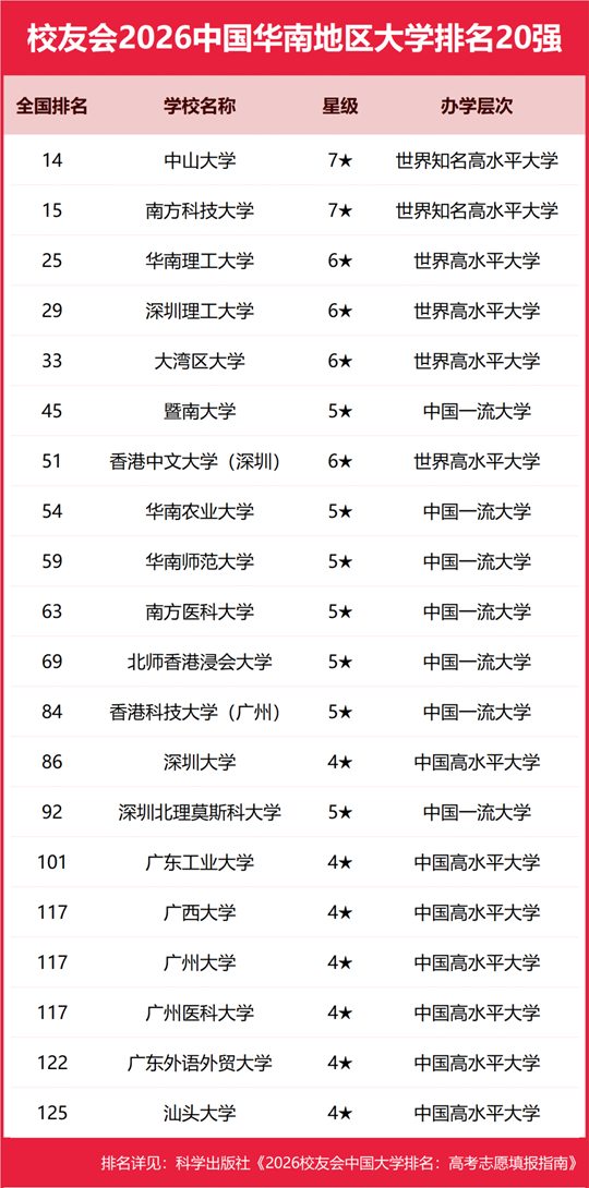 在最新校友會2026中國大學(xué)排名中,中山大學(xué)全國排名第14名,雄居2026中國華南地區(qū)大學(xué)排名第一。南方科技大學(xué)第2,華南理工大學(xué)第3。名列前10強(qiáng)的其他高校為深圳理工大學(xué)、大灣區(qū)大學(xué)、暨南大學(xué)、香港中文大學(xué)(深圳)、華南農(nóng)業(yè)大學(xué)、華南師范大學(xué)、南方醫(yī)科大學(xué)